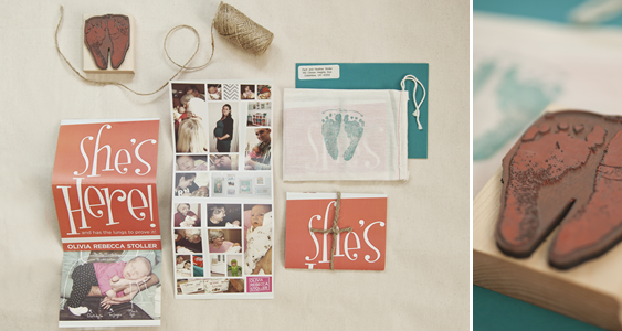 The baby announcement features Olivia meeting her extended family, call outs of features she inherited from her family members, and her birth details. Utilizing the vibrant salmon and teal colors of her nursery along with playful fonts, we created a cheerful introduction for this spunky little girl. We then layered on textures by tying the announcement together with twine and packaging it in a canvas tote. As a finishing touch we applied a stamp of her newborn footprint to the canvas bag – allowing Olivia to truly leave her own stamp on her introduction.
